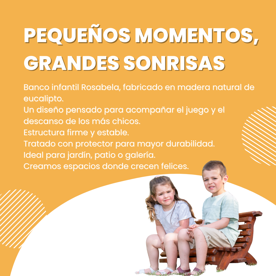 En Rosabela sabemos que los niños merecen la misma calidad, comodidad y estilo que los adultos. Por eso creamos el Banco de Plaza de Niño, una pieza diseñada especialmente para ellos, donde el tamaño, la forma y la seguridad se combinan en perfecta armonía. Con un diseño encantador y proporciones adaptadas, este banco invita a los más pequeños a tener su propio rincón al aire libre, para jugar, descansar o compartir momentos en familia.