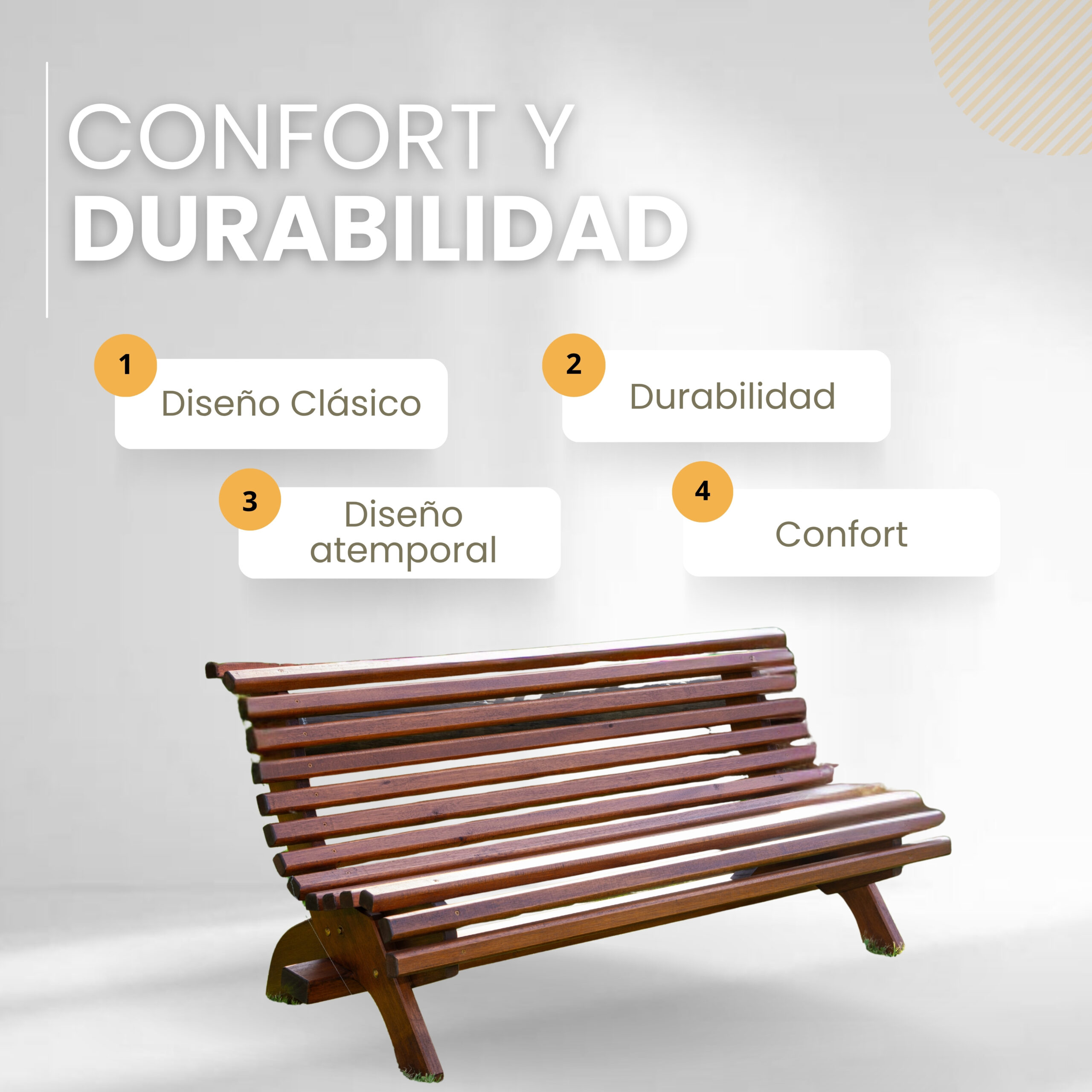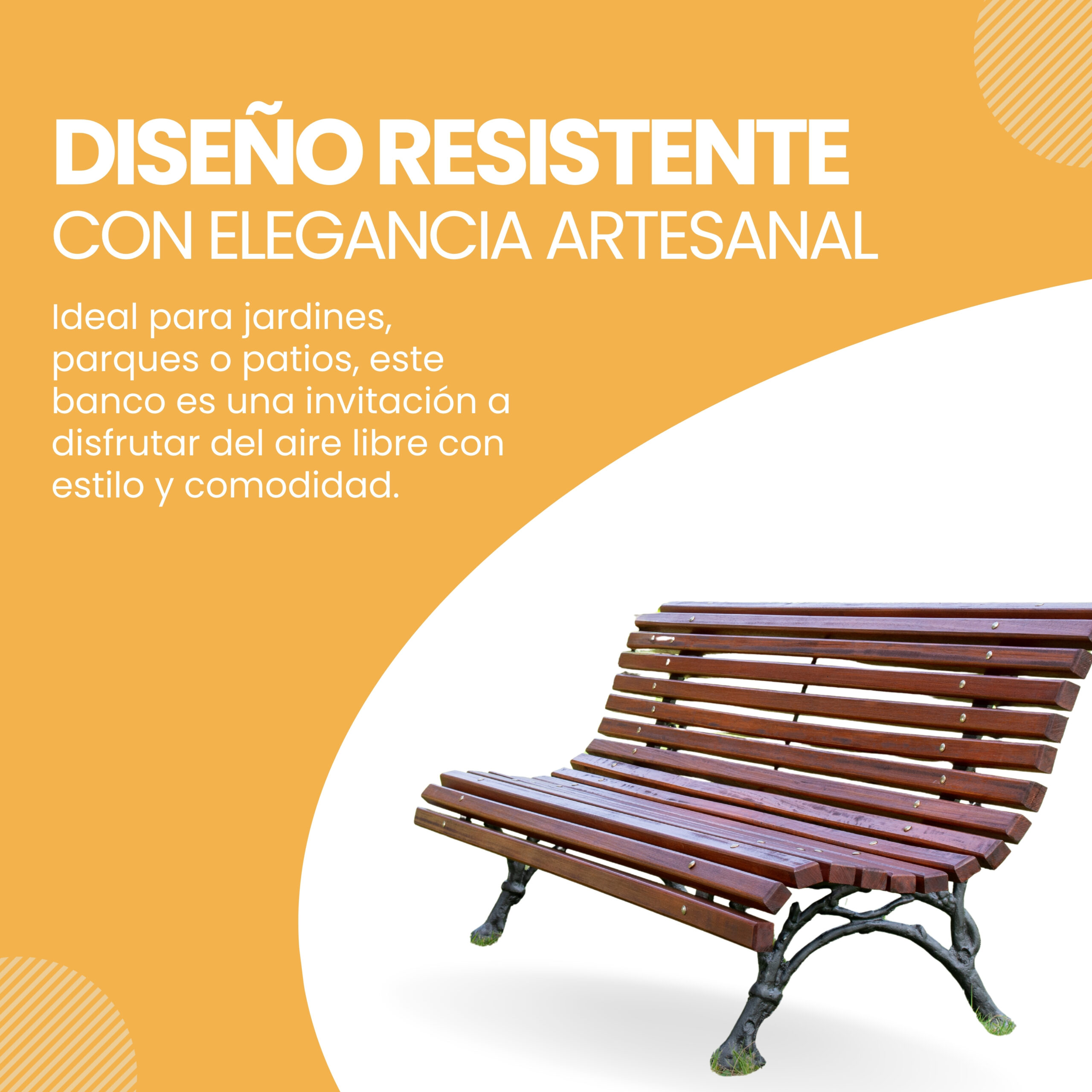 Las patas de fundición de aluminio proporcionan una base sólida y estable, mientras que el abulonado con planchuela central asegura una estructura firme y duradera. Además, el banco está tratado con 2 manos de protector, lo que lo hace resistente a las inclemencias del tiempo y prolonga su vida útil.