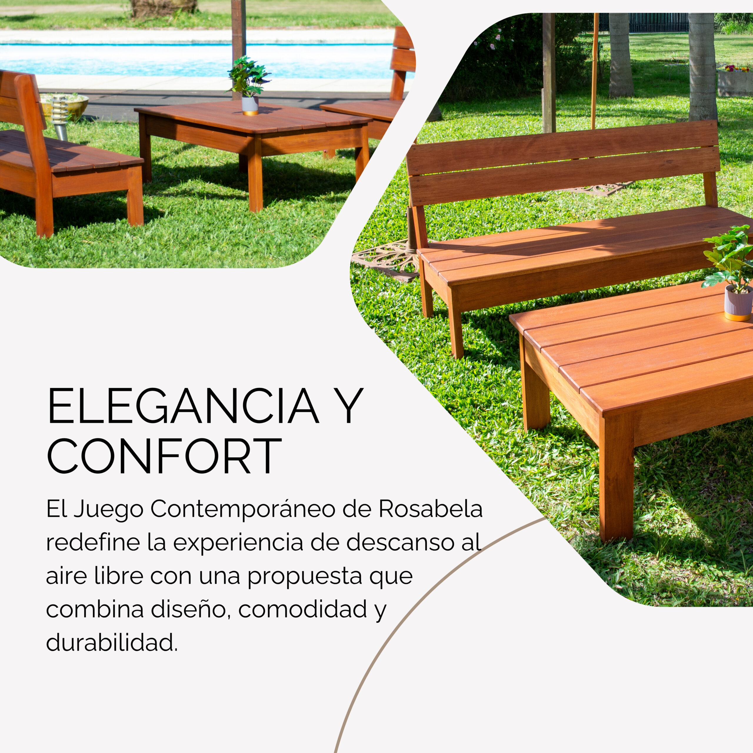 El Juego Contemporáneo de Rosabela combina diseño moderno, comodidad y resistencia para transformar tus espacios exteriores en lugares únicos. Está fabricado en madera de Eucaliptus seleccionado, tratada con dos manos de protector que aseguran durabilidad frente al sol, la lluvia y la humedad.