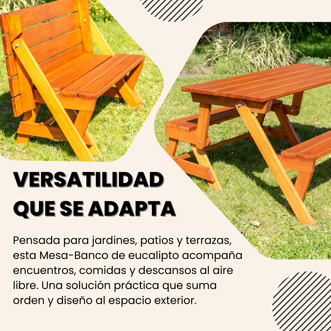 Descubre la funcionalidad doble y el diseño inteligente con la Mesa-Banco de Eucalipto de Rosabela, el mueble perfecto para quienes valoran la flexibilidad y la estética en sus espacios exteriores.