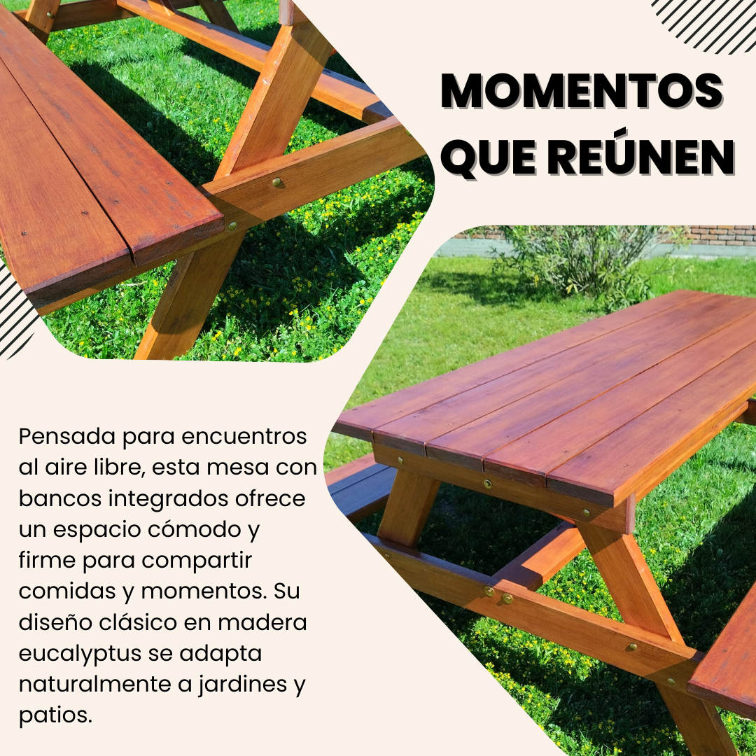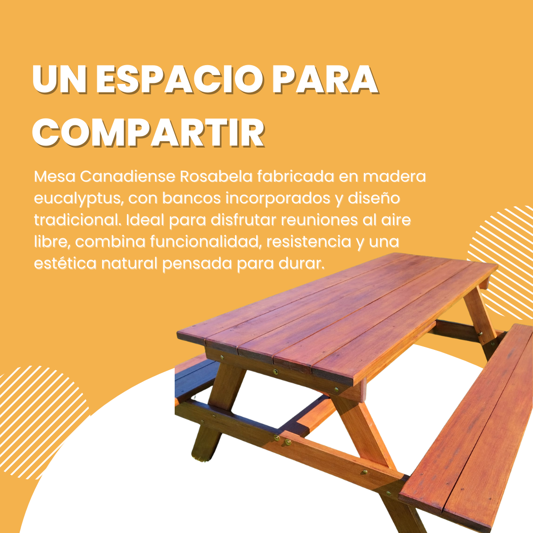 Mesa Canadiense con Bancos Incorporados de Rosabela es la fusión perfecta de funcionalidad y estética natural. Diseñada con pasión por la calidad, esta mesa está construida con madera eucalyptus seleccionada y tratada con dos manos de protector para asegurar su durabilidad y resistencia al exterior.