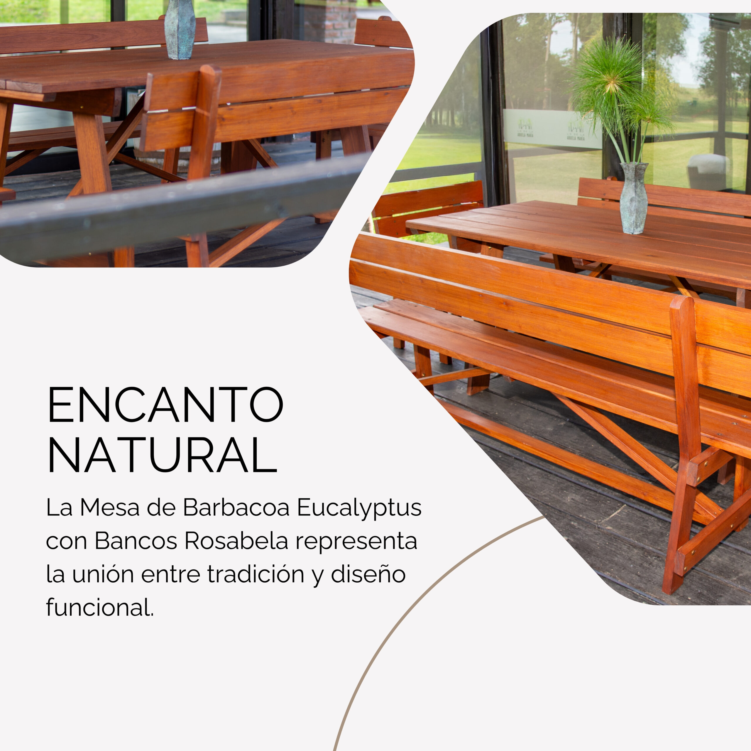 Disfruta de la belleza y durabilidad del eucalyptus con nuestra Mesa de Barbacoa con Bancos. Perfecta para reuniones familiares y asados al aire libre, esta mesa de 2,10 x 0,90 metros ofrece amplio espacio para tus invitados. Incluye 4 cómodos bancos con respaldo, ideales para largas sobremesas. Tratada con dos capas de protector para resistir las inclemencias del tiempo, es el complemento ideal para tu jardín. Hecha con maderas seleccionadas por Rosabela, un emprendimiento familiar que garantiza calidad y diseño en cada pieza.